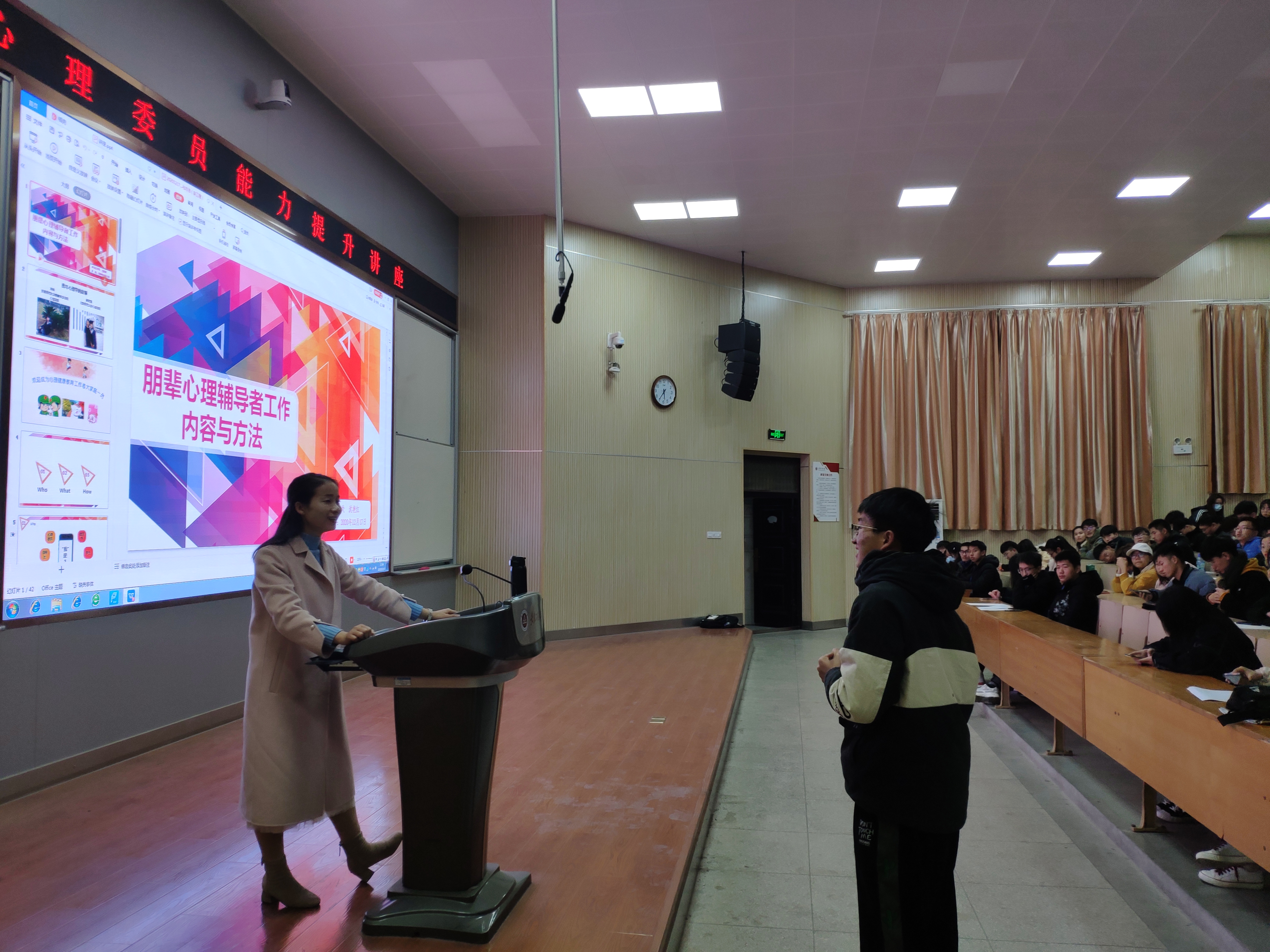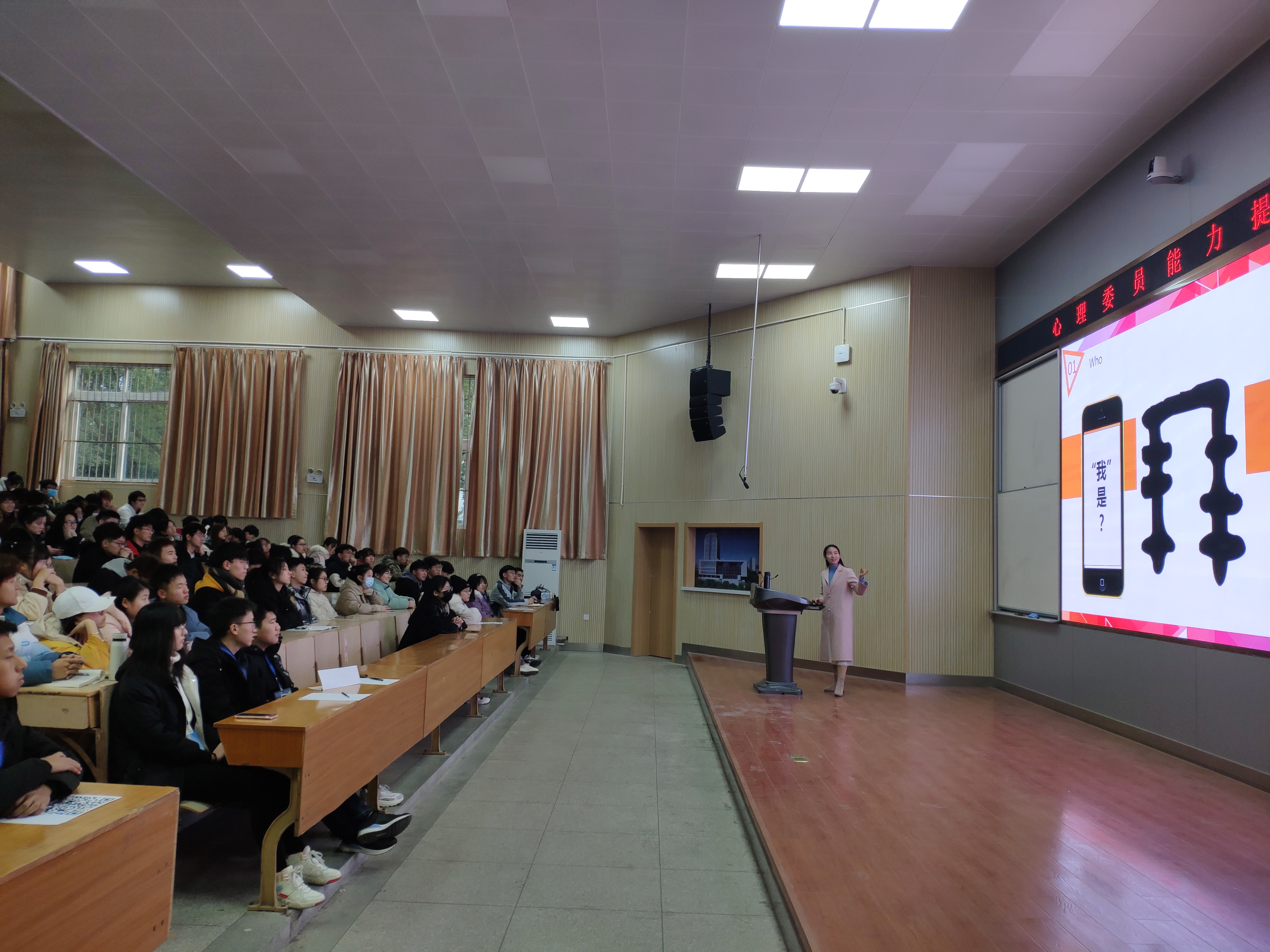 紧接着沈老师向同学们讲述了大学生的身心特点,大学生心理问题的常见表现、心理问题的类型、心理问题产生原因,又配合着一些典型案例去分析说明,有条理、很清晰的让在场的同学们明白心理问题的产生原因及危害,以及作为朋辈心理健康教育工作者,应该如何应对大学生的心理健康问题。