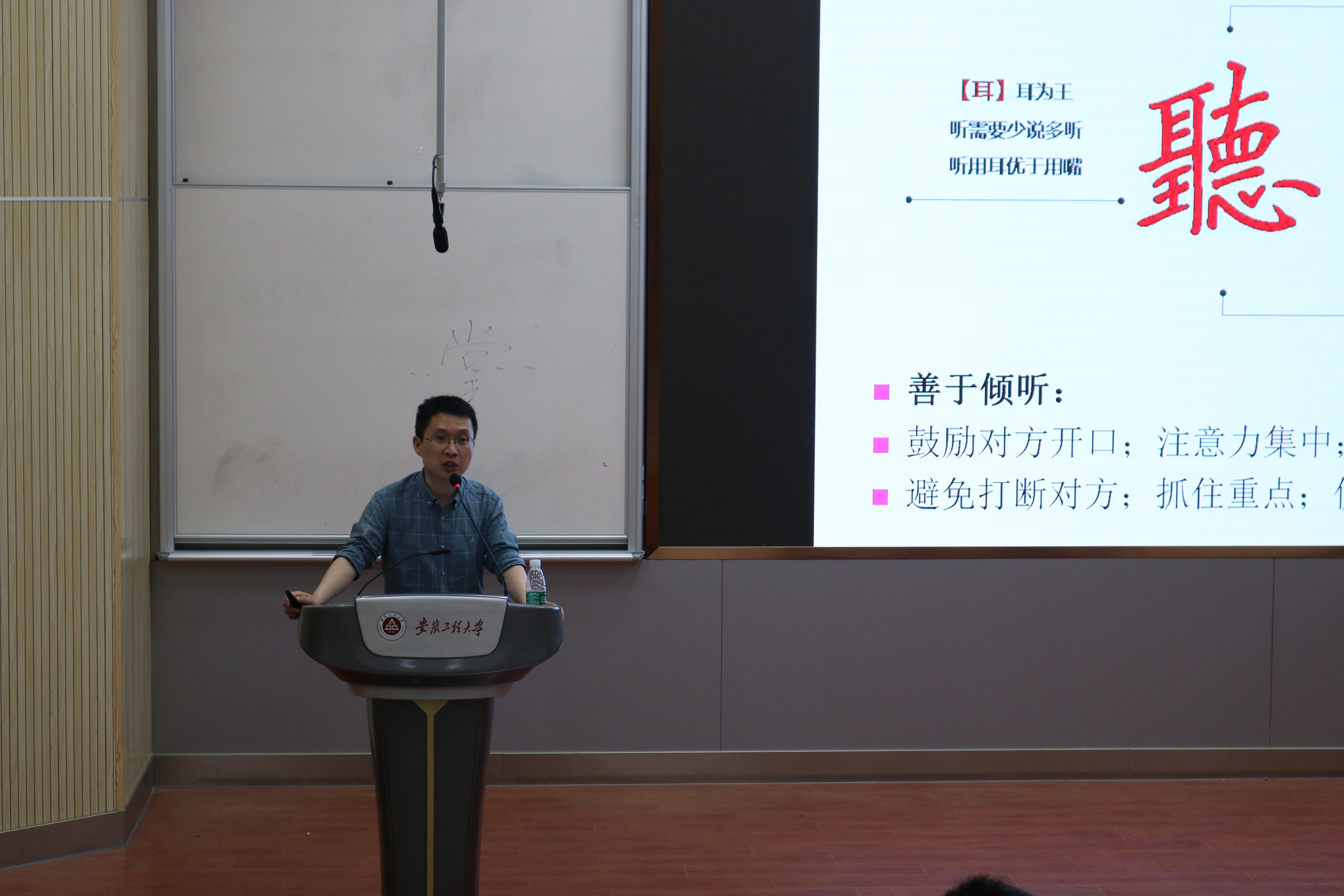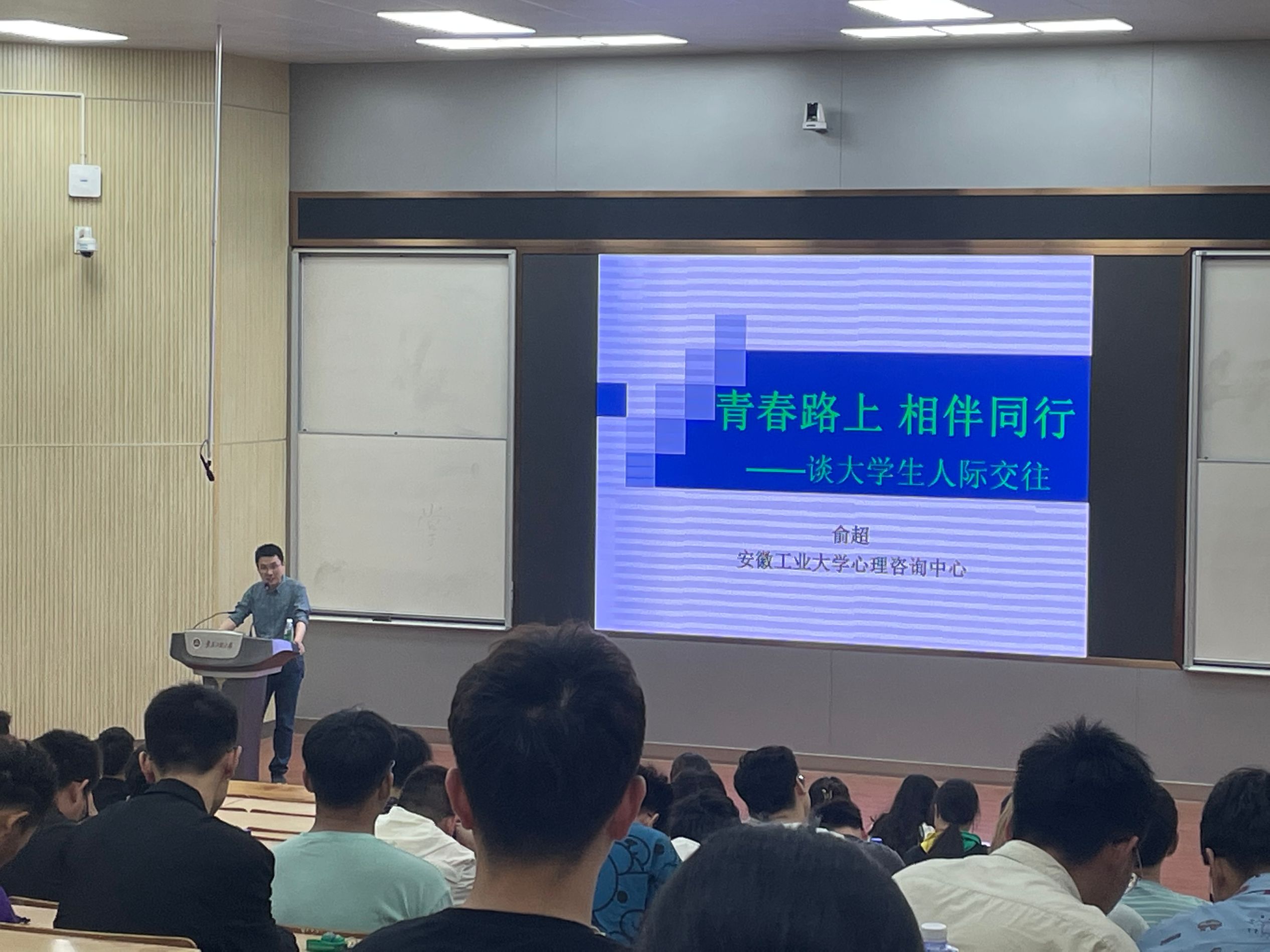 为提升大学生心理健康素质,传授心理健康常识,2021年5月17,学生处心理健康教育与咨询中心连同心理育人辅导员工作室在二教报告厅举办题为“青春路上相伴同行——谈大学生人际交往”心理健康知识讲座。各学院心理部、班级心理委员、寝室长代表共200余人聆听了讲座,安徽工业大学心理咨询中心俞超应邀主讲。