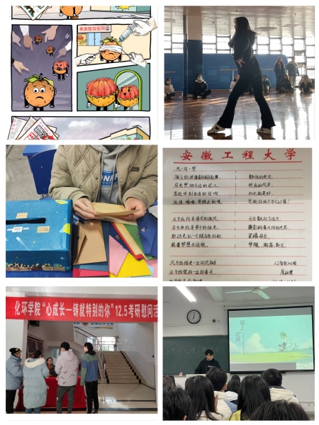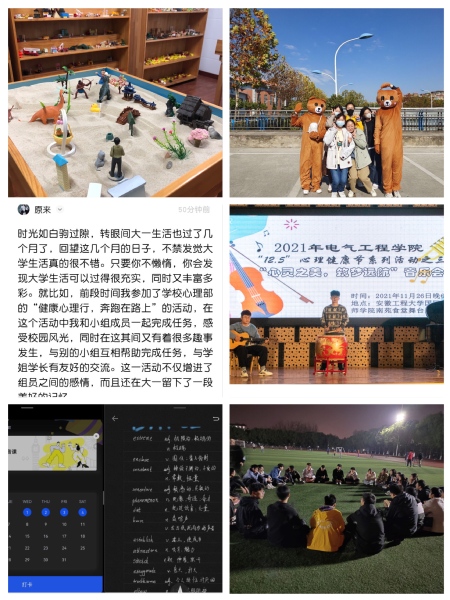 围绕“一院一主题”,各二级学院结合专业特点,制定主题鲜明的心理健康宣传教育活动。材料科学与工程学院“回忆有‘料’,心‘材’成长”温暖日记撰写活动和数理学院“发现身边的闪光点”线上征集大赛,鼓励学生记录生活,感受美好。机械工程(人工智能)学院和经济与管理学院分别举办“心成长,梦铸就”短视频大赛、心理情景剧原创剧本大赛,为学生们提供表达自我的空间。电气工程学院以专场音乐会的表现手法来滋养和疗愈学生心灵。艺术学院借助心理漫画绘心绘意,筑梦成长。生物与食品工程学院与化学与环境工程学院延续品牌,助力考研传递温暖。此外,计算机与信息学院的 21天习惯养成活动、人文学院的“青春启航,永不迷茫”主题班会、建筑工程学院的“百年奋斗,初心弥坚”英雄事迹分享活动、纺织服装学院、外国语学院和体育学院特色趣味运动会等进一步扩大了活动的覆盖面,提高了学生的参与度,营造了全校齐参与,共筑心健康的良好氛围。