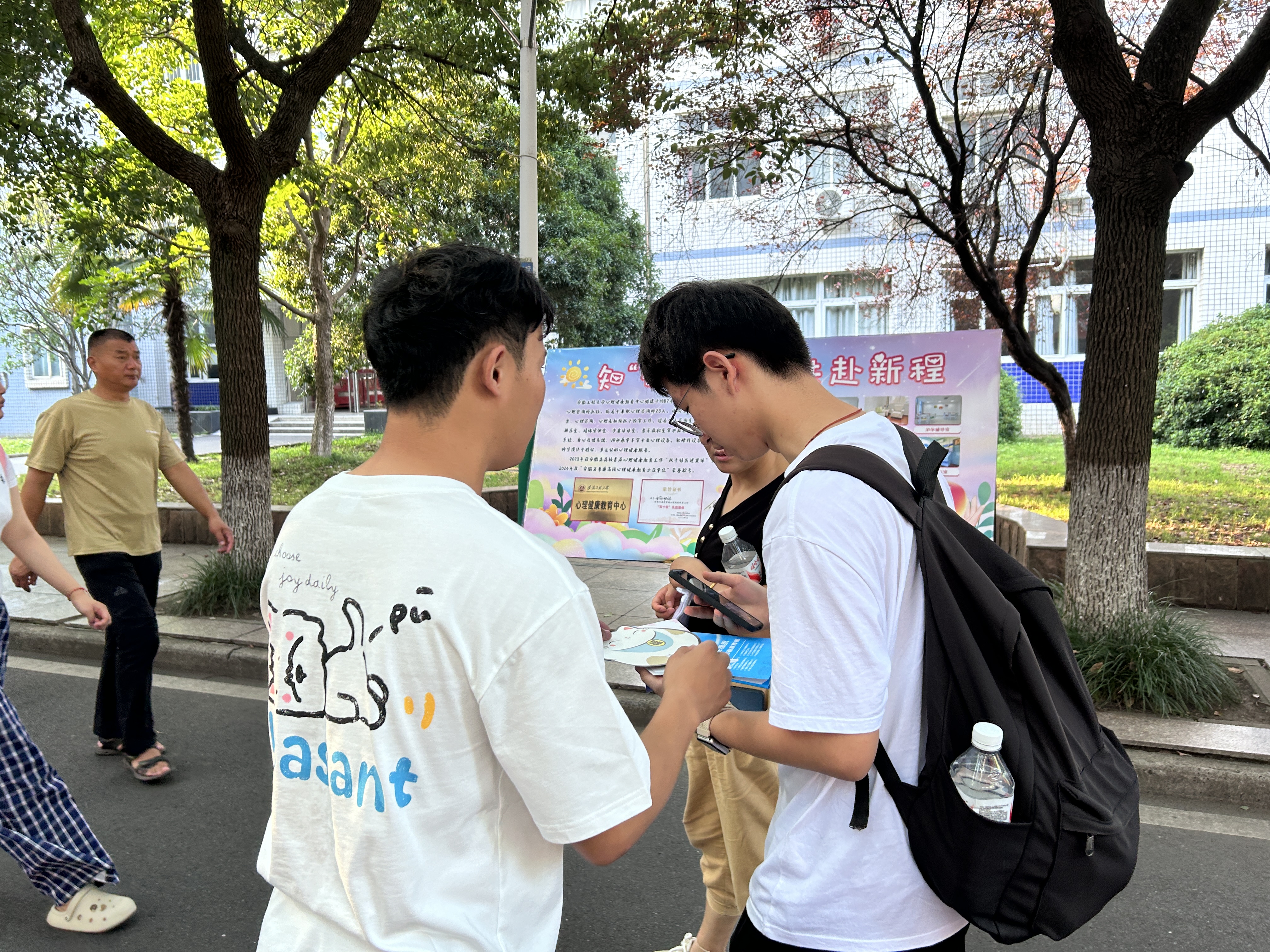 设置心理宣传展板,强化心理健康服务。精心设计制作心理宣传展板,详细介绍我校心理健康教育中心概况,迎新现场吸引了众多学生和家长的关注。定制印有心理热线和暖心寄语的扇子和卡套等文创,让“2871525”和“12356”深入学生心中。在表达对新生的欢迎与祝福的同时,邀请同学和家长关注“徽程馨语”公众号,并推送《从“我”到“我们”——新生高质量人际关系心理指南》《家校同心 为爱赋能 大学生心理健康家长指南》等系列原创心理微文,用文字对话内心世界,打开一段心灵奇旅,进一步强化心理服务宣传力度,营造关注心理健康的良好校园文化氛围。