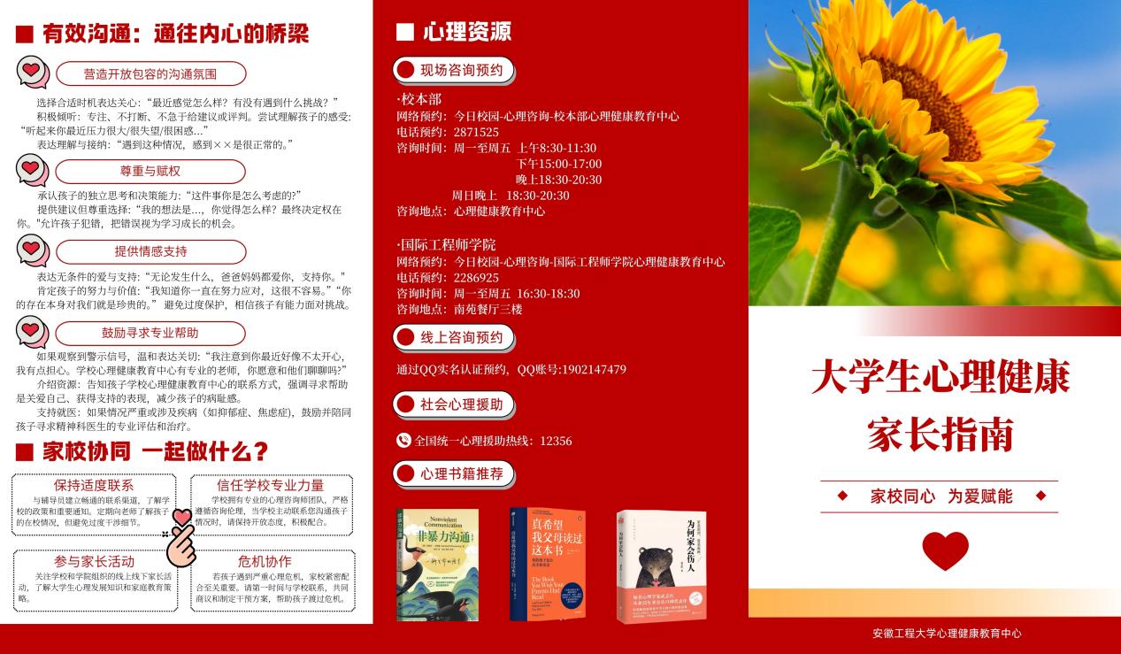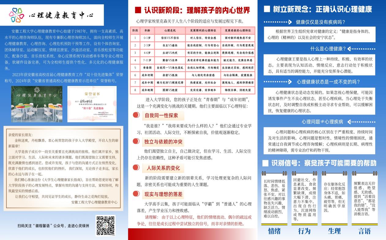 设计大学生心理健康家长指南,传递心理健康理念。为构筑家校协同的心理育人桥梁,共同守护学生的健康成长,特别设计并推送《大学生心理健康家长指南》。向家长传递科学的心理健康理念,强调家庭支持在大学生适应与发展过程中的关键作用。本次共计发放2000余份宣传手册到家长及学生手中,涵盖“认识大学生心理发展新阶段”、“树立积极正向的心理健康观念”、“及时识别心理问题的预警信号” 以及 “建立有效良性的亲子沟通模式” 四大核心板块,为家长提供了如何远距离关爱子女、保持亲子情感联结的系统性指导。