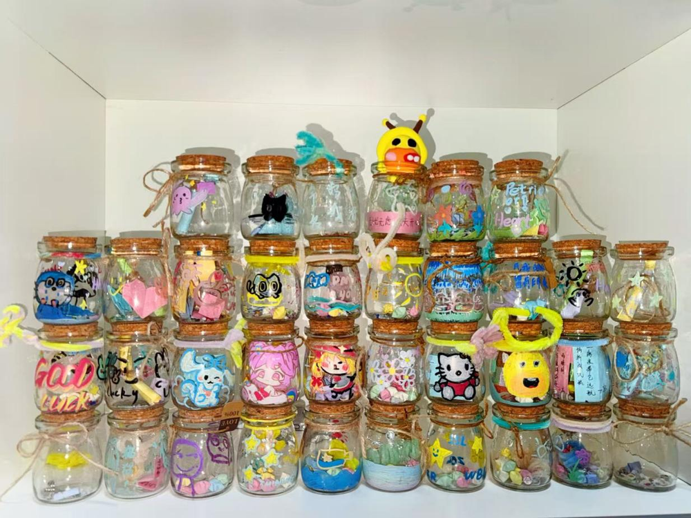 活动吸引了百余名同学参与,以“情绪盲盒互动”小游戏破冰——同学们抽取写有减压小任务的纸条,或模仿趣味表情、或分享治愈小事,在轻松互动中卸下拘谨,为后续交流铺垫温馨氛围。随后进入漂流瓶制作环节,现场备好彩纸、丝带、颜料等丰富材料,大家装饰瓶身,将学业困惑、生活期许、暖心祝福等心声写在纸条上封存,在创作中完成与自我的深度对话。“倾听同行”分享环节暖意融融,心理部成员林同学率先分享:“备考压力大时总焦虑,写下烦恼封入瓶中像卸下重担,也想告诉大家,正视情绪才是治愈的开始。”同学小周则念出祝福:“愿每个努力的人都被温柔以待,就像这次活动让我知道,我们不是独自前行。”现场同学们坦诚交流,在倾听中收获理解与支持,镜头定格下诸多真挚瞬间。活动尾声,漂流瓶被统一悬挂展示成“心灵风景线”,参与者陆续带走专属瓶子,留存这份心灵印记。