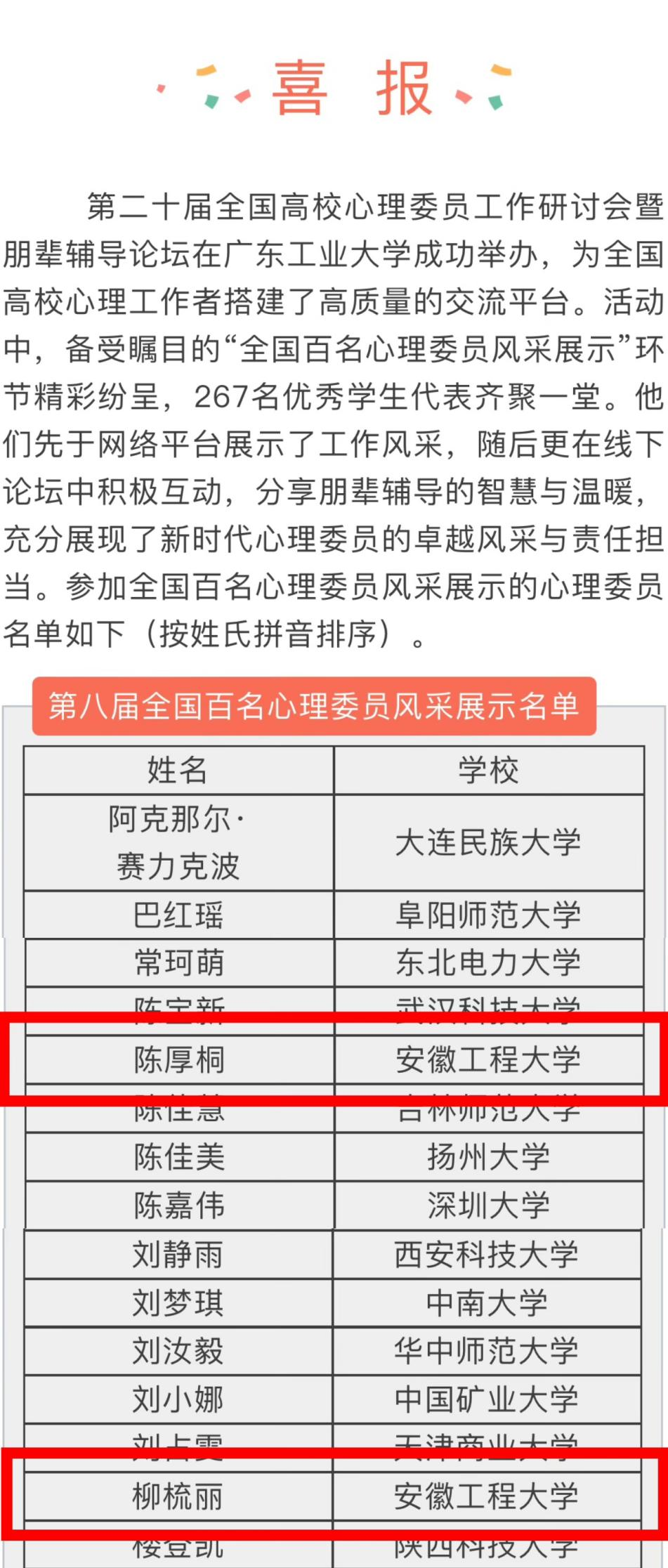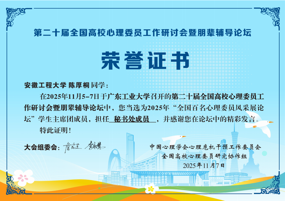 近日,由中国心理学会心理危机干预工作委员会主办、广东工业大学承办的第二十届全国高校心理委员工作研讨会暨朋辈辅导论坛传来捷报,我校学子喜获佳绩。材料科学与工程学院陈厚桐及生物与食品工程学院柳梳丽工作事迹入选(2025)《全国百名心理委员风采展》。陈厚桐经竞选演讲与综合评议,当选全国百名心理委员风采展论坛学生主席团成员。