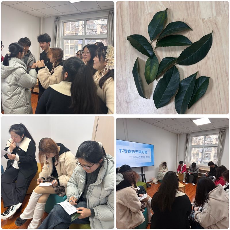 本次活动在轻松愉快的氛围中有序展开。在团体的开始阶段,通过“桃花朵朵开”暖身游戏,成员们迅速打破沉默,现场欢笑声不断。随后的“循环自我介绍”环节,大家在轻松互动中记住彼此的名字与特点,建立初步的信任关系。进入工作阶段,三个结构化练习层层递进。首先是“一片独特的叶子”体验活动,每位成员选择并仔细观察一片树叶,两分钟后所有树叶混合在一起,大家需要在众多相似的叶片中找出属于自己的那一枚。起初的犹豫不决与最后的精准识别,让大家直观感受到,正如每一片叶子都有独特的纹理,每一个生命也都是独一无二的存在。在此基础上,“独特的我”纸笔练习引导成员静心梳理自己的长处与局限,并在小组内坦诚分享,接纳自己的不完美,才能更宽容地看待他人。随后的“天生我才”练习将活动推向高潮,成员们从外表、性格、对家人的态度、成功经验等七个维度写下最欣赏自己的地方,并大声在小组中读出。当一句句“我最欣赏自己……”在团体中回响,自信的光芒在每个人眼中点亮。活动尾声,暖身游戏中落单的同学被邀请到圆圈中心,接受全体成员真诚具体的赞美,温暖的氛围感染在场的每一个人。