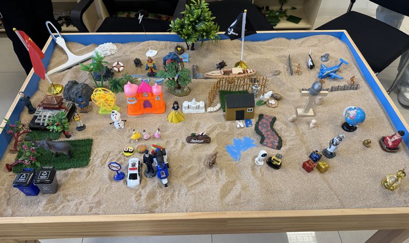 活动伊始,李老师引导大家进行自我介绍,帮助同学们打破彼此之间的陌生感,迅速融入团体氛围。破冰结束后,李老师向同学们介绍沙盘游戏背后的荣格分析心理学象征理论与原型理论,讲解沙盘、沙具及游戏规则,引导同学们在音乐的流动下闭上双眼,将双手放进沙盘里,体验与沙子的联结,通过自由构建场景,表达内心世界,从而探索潜意识、缓解压力、促进心理成长。实现注意聚焦后,10位成员依次进行6轮摆放,沙盘构建旅程中,同学们在无声中传递默契,在自我与集体中寻得平衡,编织出信任与默契的纽带。作品完成后,同学们共同为自己的沙盘世界命名,《小世界》这个主题赋予了这个沙盘独属于他们的意义。